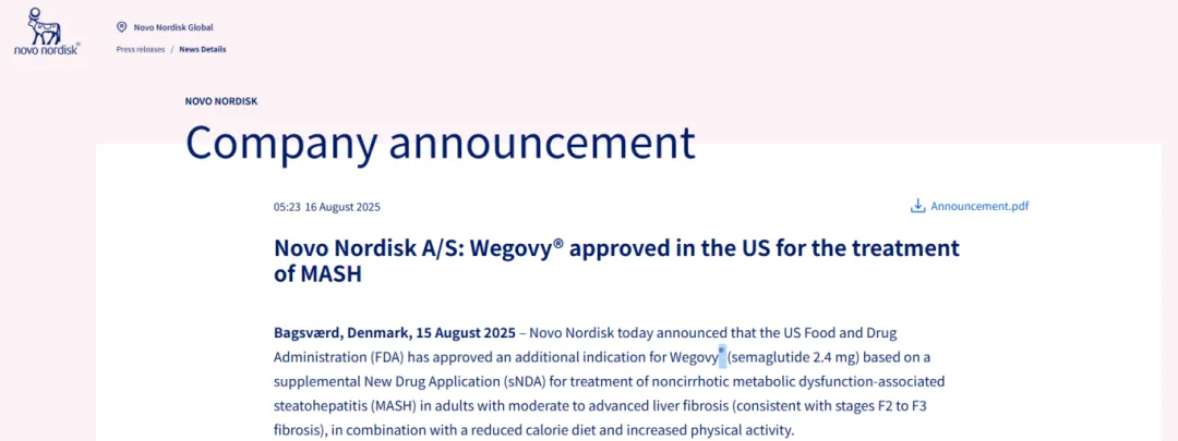 2025年8月15日,美國食品藥品監(jiān)督管理局(FDA)已批準(zhǔn)司美格魯肽Wegovy?(Semaglutide 2.4 mg)的補充新藥申請(sNDA),用于治療伴有中度至進展期纖維化(F2至F3期)的非肝硬化代謝相關(guān)脂肪性肝炎(MASH)成人患者,用藥時需聯(lián)合低熱量飲食及增加體力活動。